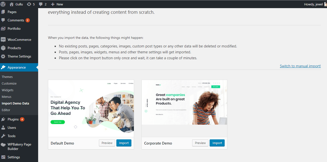 Demo Import Estimated reading: 2 minutes 891 views If you want your site to look like exactly the ‘Gullu’ demos then you have to import the demo content successfully. We integrated the One Click Demo installation feature to ‘Gullu’ WordPress theme. You can import all demo content just by a click only. OneClick Demo Installation Process Install the theme and activate it. Then install all the required plugins. Make sure all the required plugins are activated.After activating all the required plugins navigate to Appearance > ‘One Click Demo Import’ menu from the WordPress dashboard. Note: If the option data do not import then you have to import it manually. Navigate to ‘Theme Settings > Backup’. Then copy-paste the backup string here and click on the Import a Backup button. You will find the backup string in the options.txt file. The recommended method to import the demo content. If you failed to import the demo content by one click then you have to follow the below steps to import the demo content manually. You will get all demo content data with the theme package. You will find the demos in ‘gullu>inc/demo{disired-demo-number} this path. Navigate to Tools > Import then install the WordPress plugin and click on the ‘Run Importer’. Upload here the ‘theme_content.xml’ file.Install the ‘Widget Importer & Exporter‘ plugin to import the demo widgets. Then navigate to Tools > Widget Importer & Exporter and upload here the ‘widget_data.wie’ file.Now you have to import the Dental Options as like the demo. Navigate to ‘Theme Settings > Backup’. Then copy-paste the backup string here and click on the Import a Backup button. You will find the backup string in the options.txt file. ArticlesHow to update premium plugins?