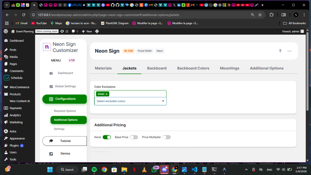 Color exclusion selector and pricing options for jackets.