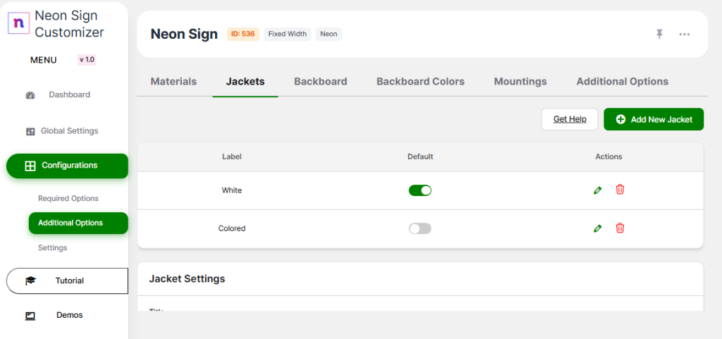 To add a jacket, open your neon configuration and go to: